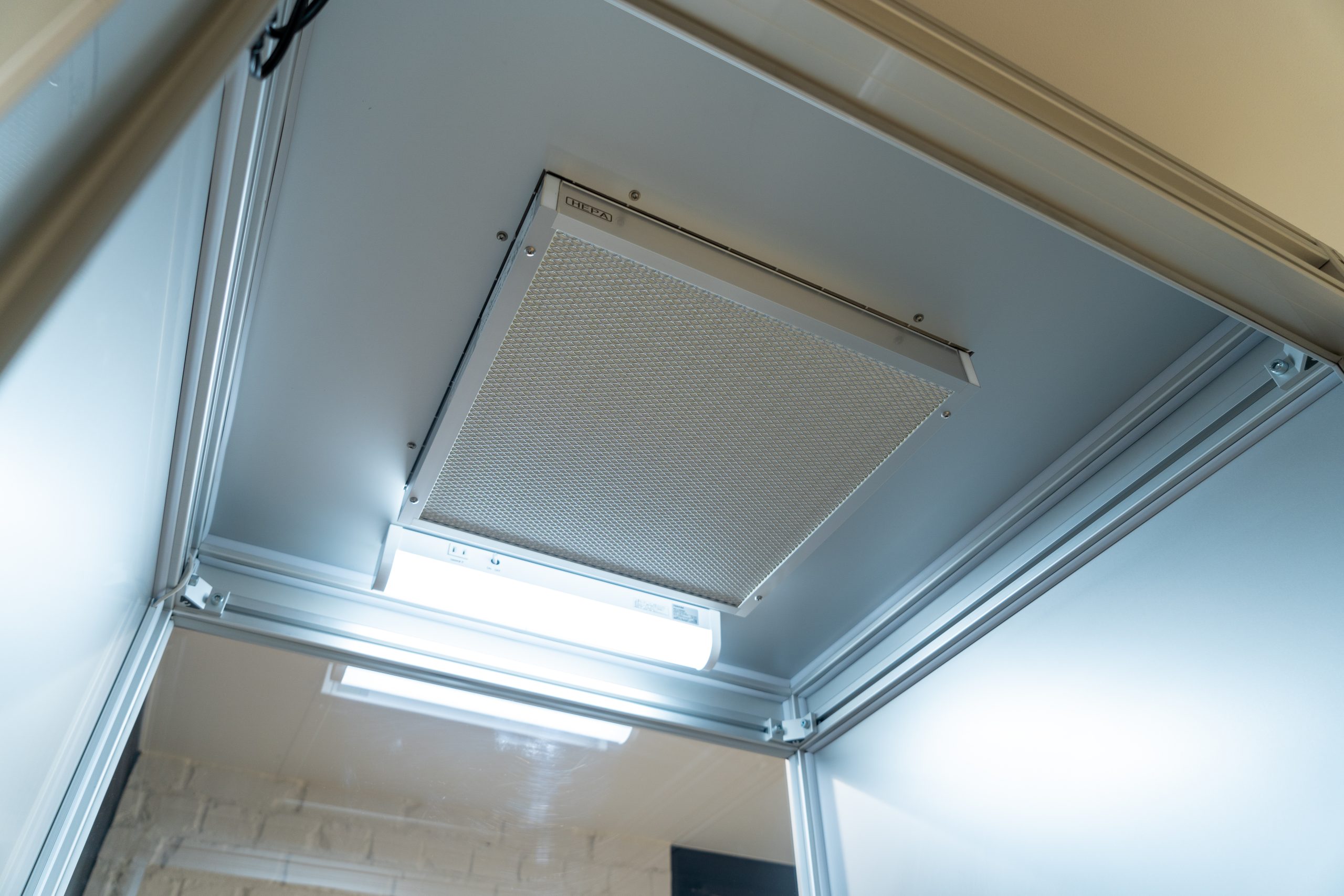 ボックス型PCR検査用ブースはウォークスルータイプ。医療従事者を感染から守る「陰圧」は、部屋から部屋への相互汚染を防ぐために使用される隔離技術です。ボックス内部の空気圧を外部より高い設定をしておりますので、ボックス中の空気を内部に入れません。またクリーン送風機を備え付けておりますので、ブース内をパワフル換気。ダブルの対策で高い安全性が実現します。